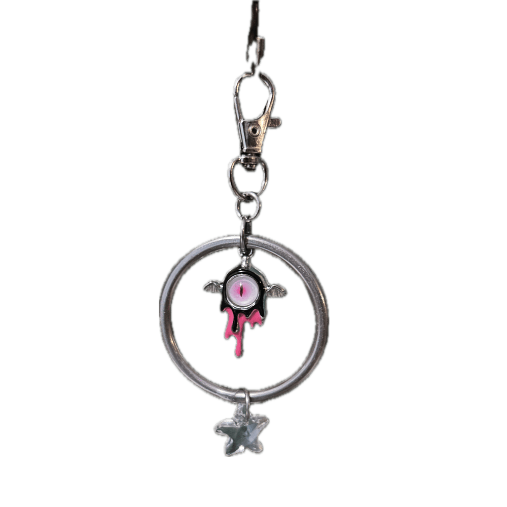 Handmade bag charm/keychain with drippy demon/angel eye. Stainless steel hoop and twinkly star dangle.